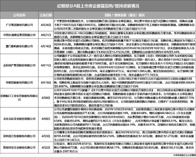除上述房企外,近期还有A股多家上市房企发布了股票回购或增持相关进展情况。